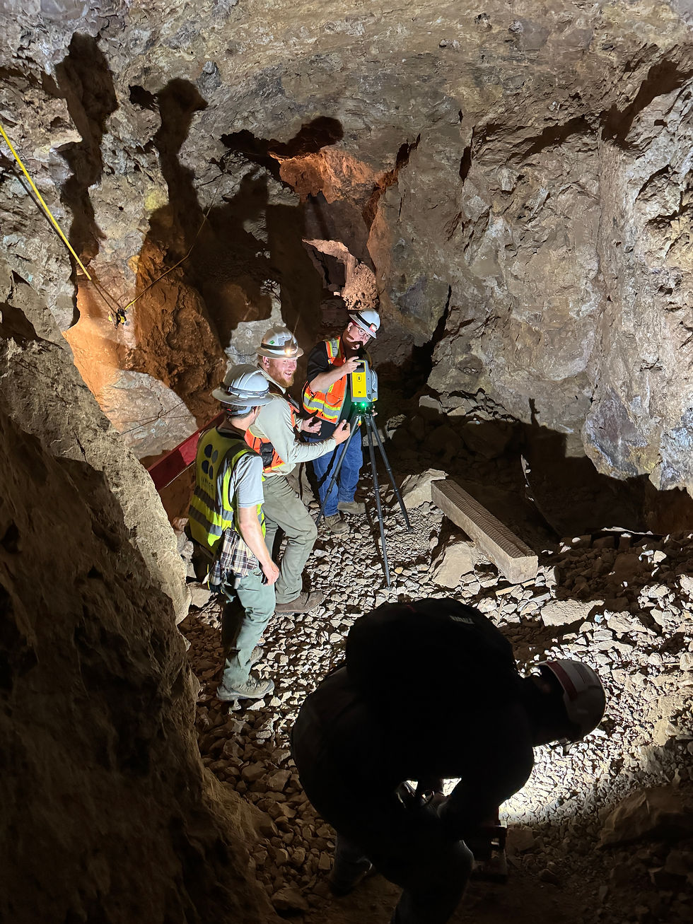 Team 1 made their way into the mine, winding through the tight tunnels carved over 120 years prior. Portions of this mine had water dripping off the ceiling and onto the teams hardhats. A variety of lights shot through the dark, some mounted on hardhats some in the teams hands. Fortunately, the team was led by expert mine explorer Andrew Keepers, who had spent countless hours ensuring this very mine was both structurally sound and safe to explore. The adit wove back and forth, with drifts branching off left and right. Without knowing the correct path one could have easily been lost. As team 1 approached the main hall at the bottom they were met with a ladder to climb down. One at a time they carefully climbed down and transferred their equipment into the chamber. This chamber was far bigger than any of them had envisioned, and was illuminated by dim lights scattered throughout, creating a chilling ambiance. Their guide Andrew gave them a quick orientation tour so they could grasp the real size of this space. Then they got to work, scan station after scan station. Over 20 scan stations to be exact! Constantly moving and working, deploying large flood lights the team had packed in to ensure high quality photos along with the scan. For many this was their first time running a scanner, and everyone got hands on experience.